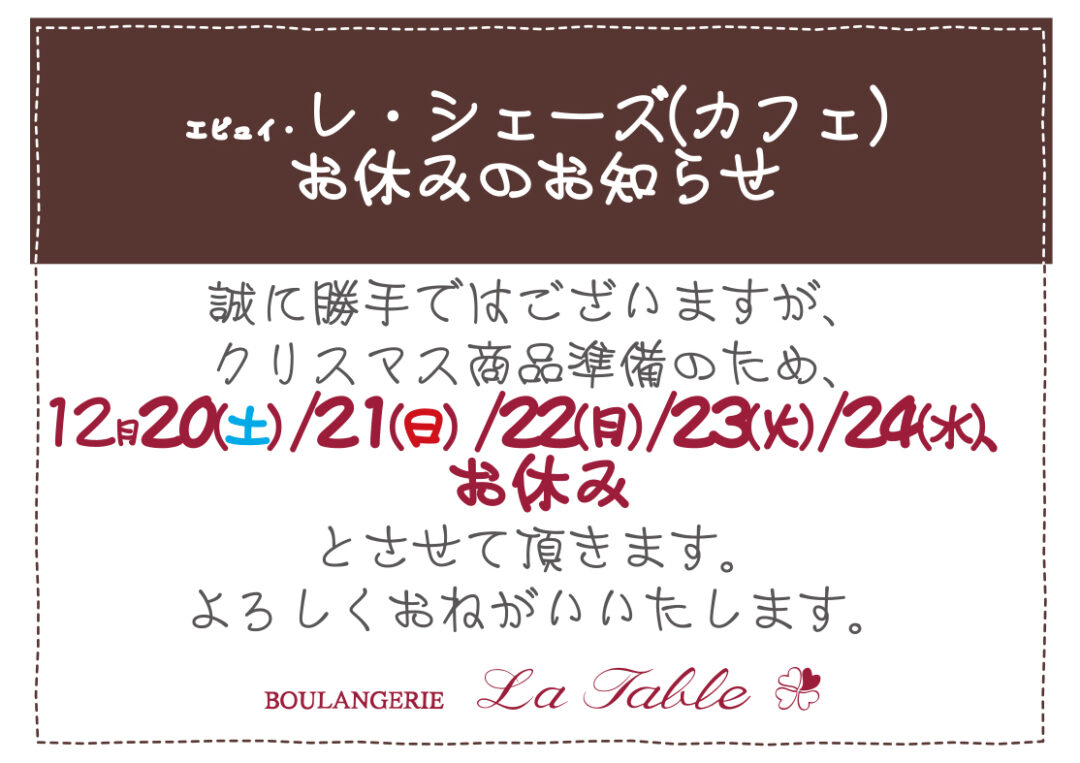 12月20日(土)~24日(水)までお休みさせていただきます。